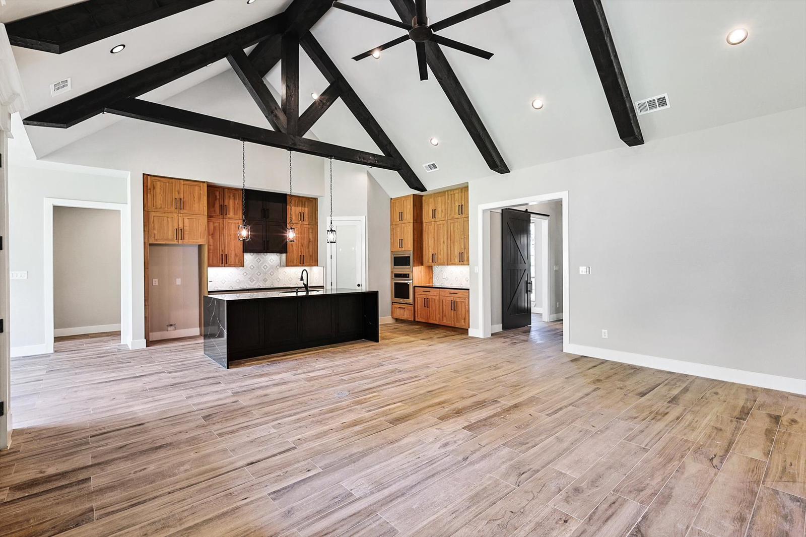 Traditional country homes offer many of the key architectural notes that modern farmhouse buildings use: timber cladding, lofted spaces and, often, wraparound porches. Other external touches to consider are industrial elements, such as metal light fixtures and exposed beams, which add a modern touch to the traditional farmhouse aesthetic. Additional design elements commonly found in modern farmhouses include large windows that allow for natural light to flow into the space, open floor plans that create a sense of spaciousness and connectivity between the different areas of the farmhouse, and minimalist interior design with clean lines and a neutral color palette.